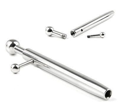 The wearer inserts the hollow tube into his urethra and keeps it in place by screwing the pin that is coming out of the side of the wand through his Price Albert piercing opening.